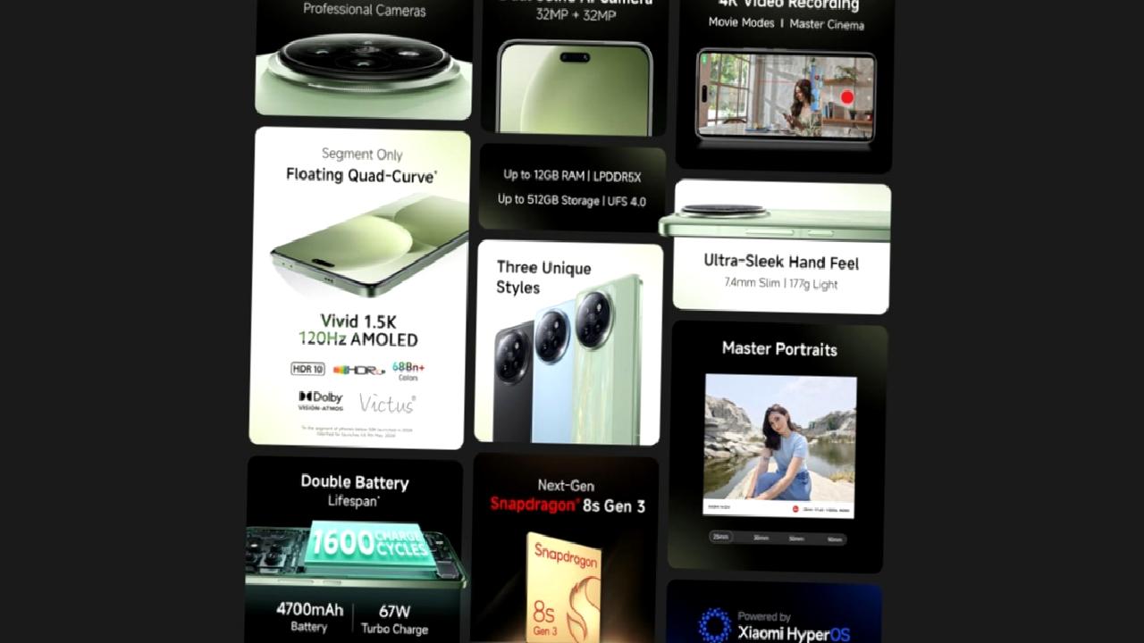 Xiaomi 14 Civi, 50 megapiksel ana, 12 megapiksel ultra geniş açılı, 50 megapiksel 2x telefoto ve 32 megapiksel selfie olmak üzere Leica kameralara sahip. 67W süratli şarj takviyesine sahip 4,700 mAh batarya ile 40 dakikada yüzde 100 şarja ulaşabilen telefon, şimdilik Hindistan pazarında satışa çıktı.
