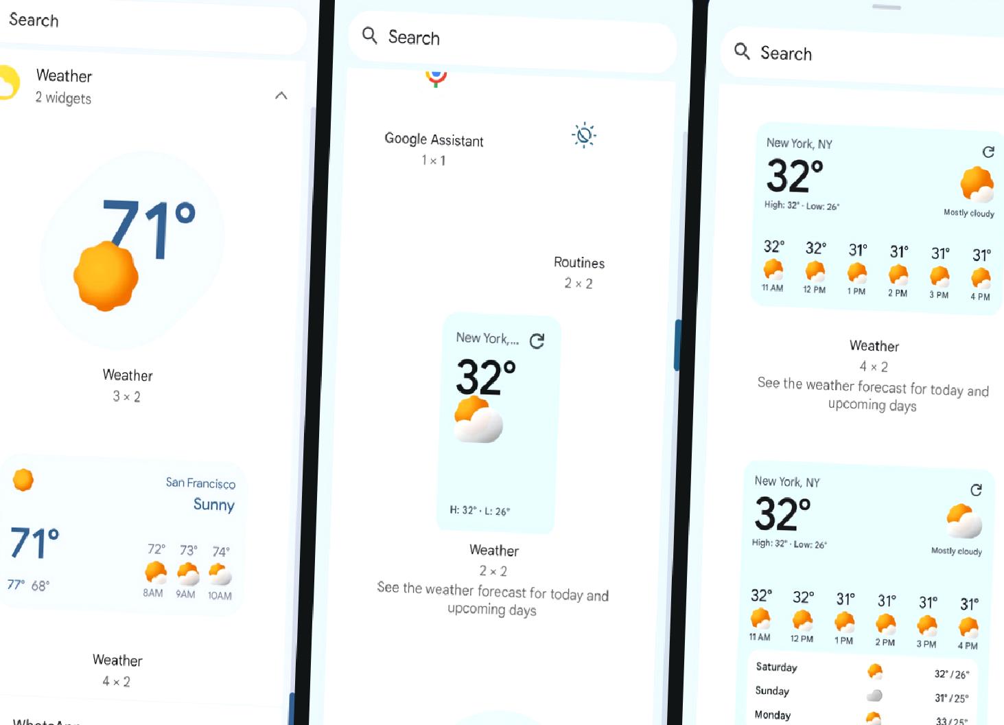 Şu anda Google uygulamasında iki hava durumu widget’ı bulunuyor: Şimdiki hava durumunu gösteren 3×2 boyutunda bir widget ve saatlik iddiaları gösteren 4×2 boyutunda bir widget. Her ikisi de yeniden boyutlandırılabiliyor, fakat boyutları değiştiğinde içerikleri ve biçimleri de değişiyor.