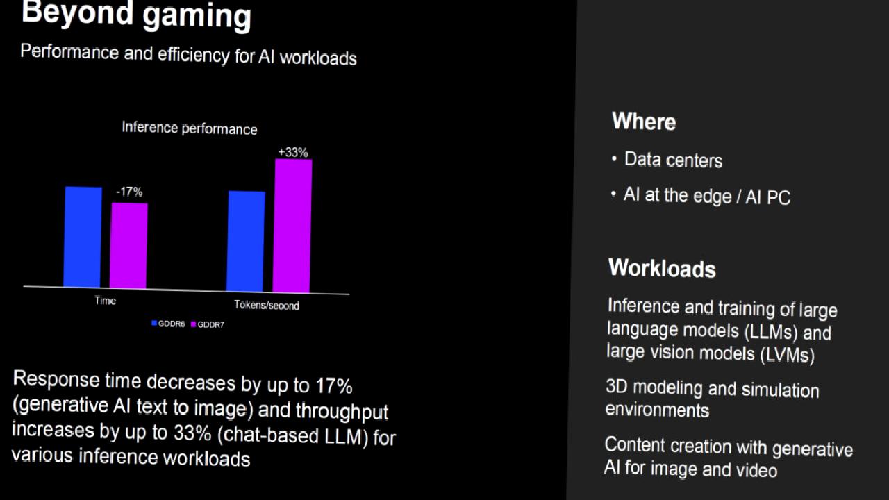 Micron’un tezlerine göre, GDDR7 bellek, 1080p, 1440p ve 4K çözünürlüklerde ray tracing ve rasterizasyon performansında yüzde 30’dan fazla FPS artışı sağlayacak. Yani, oyunlar daha pürüzsüz ve daha gerçekçi görünecek. Bilhassa AI dayanaklı oyunlarda performans ve kare tamponu ölçeklendirmesi ile üst seviye bir oyun tecrübesi yaşayacaksınız.