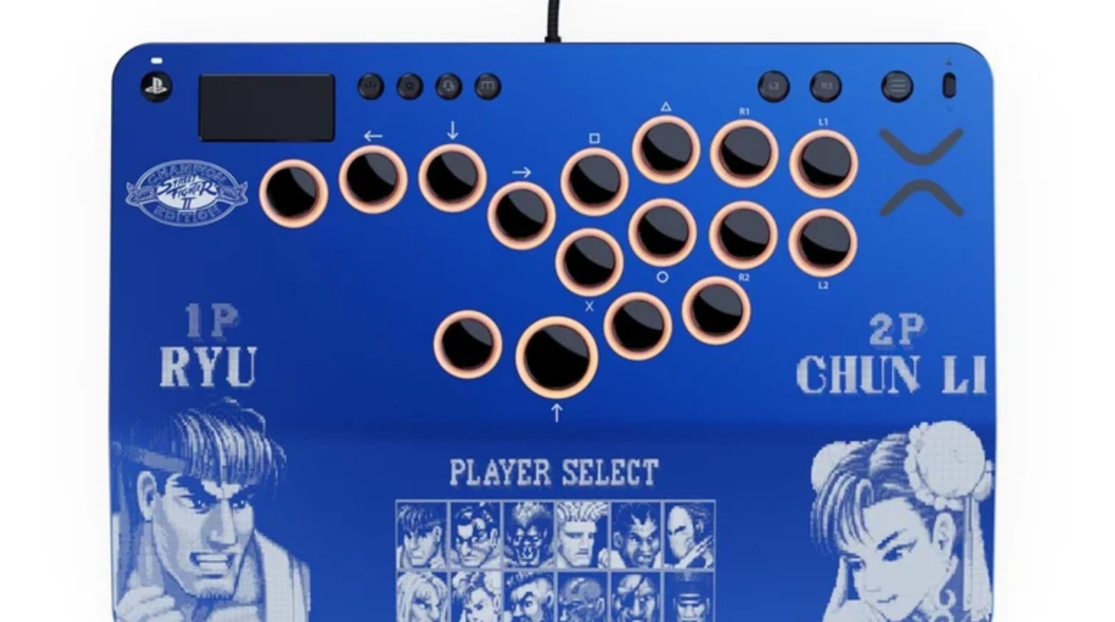 Yeni kontrolcünün ilk dikkat çeken kısmı tasarımı. Cihaz PlayStation mavisi renkte. Üst yüzeyde ise Street Fighter karakter seçim ekranını gösteren bir grafik bulunuyor.
