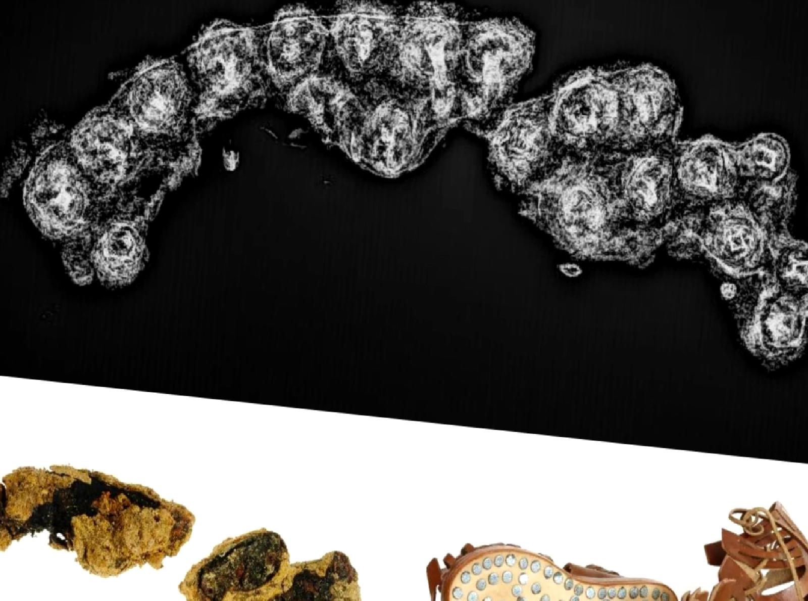 Üstte X-ray taraması, altta bulunan kalıntılar ve sandaletin yeniden oluşturulmuş hali.